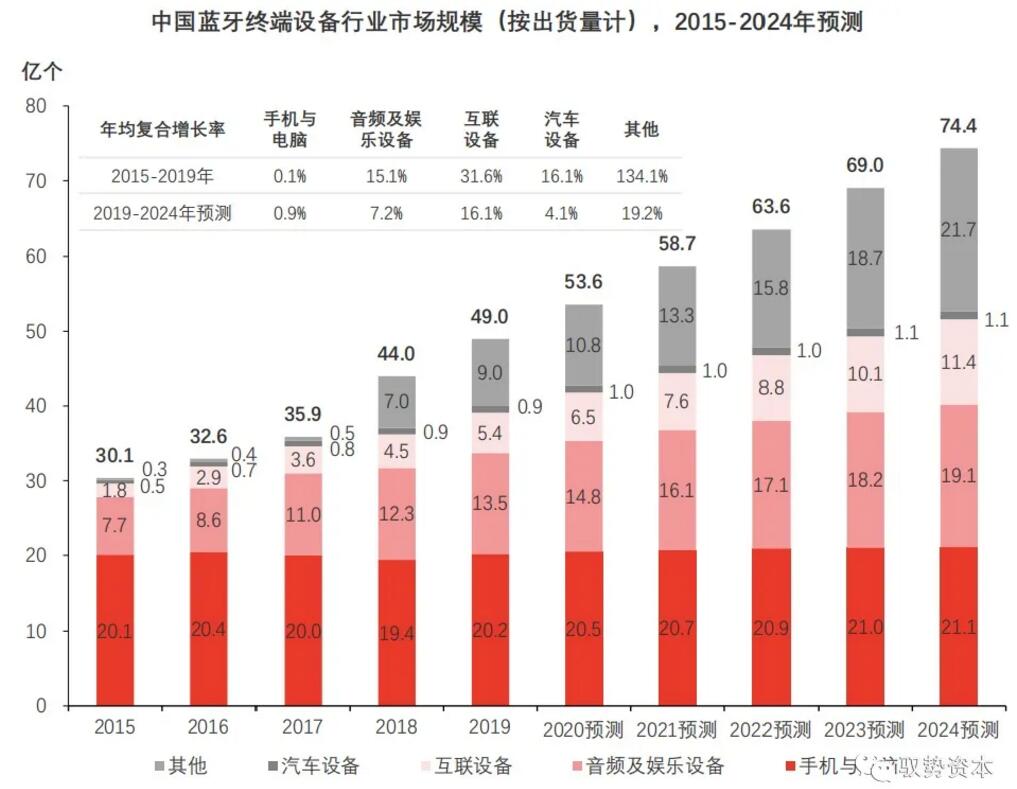 2015年至2020年期間中國(guó)藍(lán)牙終端設(shè)備出貨量穩(wěn)步提升,未來伴隨藍(lán)牙芯片在各領(lǐng)域滲透率持續(xù)提升,預(yù)計(jì)至2024年藍(lán)牙終端設(shè)備出貨量將達(dá)74.4億個(gè)。