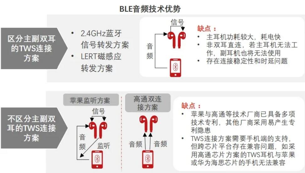 藍(lán)牙芯片的重要應(yīng)用場景。早期藍(lán)牙標(biāo)準(zhǔn)不支持無線多路直連,無法實現(xiàn)雙耳同步傳輸,普通藍(lán)牙耳機僅能實現(xiàn)一對一連接,蘋果采用Snoop監(jiān)聽模式,在一只耳機進行藍(lán)牙音頻傳輸時,另一只耳機利用它們之間的私有協(xié)議對其進行監(jiān)聽,達(dá)到1對2連接的目的。由于蘋果對監(jiān)聽模式進行專利封鎖,早期安卓TWS廠商主要采用relay轉(zhuǎn)發(fā)模式,將音頻從手機傳至左耳設(shè)備,再由左耳轉(zhuǎn)發(fā)至右耳,但該方案存在諸多劣勢,例如(1)音頻傳輸過程較長造成連接不穩(wěn)定;(2)延遲問題嚴(yán)重;(3)接受音頻傳輸?shù)闹饔枚鷻C的電池功耗顯著高于輔用耳機。安卓TWS廠商受限于技術(shù)實力,TWS耳機產(chǎn)品音頻傳輸體驗亟待提升。