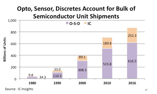 雖然集成電路技術(shù)不斷發(fā)展,越來(lái)越多的功能被集成到一顆存儲(chǔ)芯片中,從而以系統(tǒng)的角度來(lái)看用到的芯片數(shù)量越來(lái)越少,但I(xiàn)C Insights的統(tǒng)計(jì)結(jié)果顯示,全球半導(dǎo)體出貨量中,集成電路占比依然很低,而光電器件、傳感器與分立器件(Opto-Sensor-Discrete,簡(jiǎn)稱O-S-D)的比重仍然超過(guò)七成。