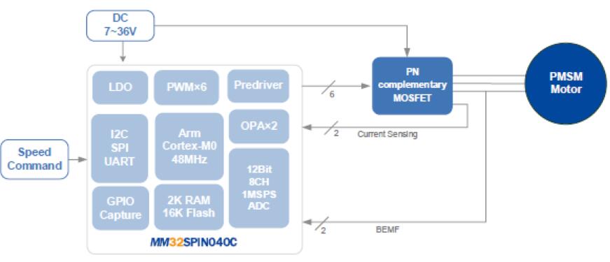 方案采用的主控MM32SPIN040工作頻率可達48MHz,內(nèi)置16KB Flash,2KB SRAM高速存儲器,針對電機應(yīng)用內(nèi)置2個運放,預(yù)驅(qū)工作電壓高達36V。適合于三相永磁無刷電機,電動工具等多種應(yīng)用場合。該方案適用于落地扇、塔扇、循環(huán)扇、吊扇等多種品類的風(fēng)扇設(shè)備。我司英尚微可提供高速吹風(fēng)筒、電扇等各種電機應(yīng)用方案。