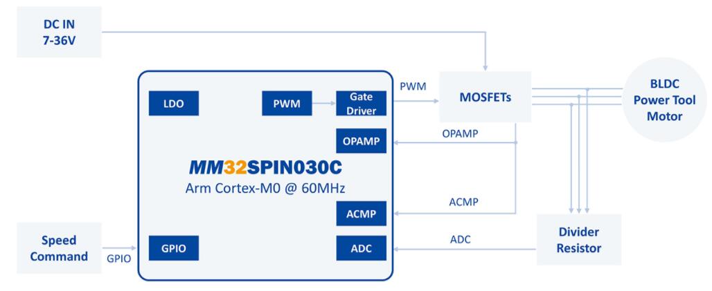 MM32SPIN030C,Arm® Cortex-M0內(nèi)核,最高工作頻率可達60MHz,內(nèi)置存儲器32KB Flash和4KB SRAM,具有1 路 12 位模數(shù)轉(zhuǎn)換器 ADC,支持 11 通道,采樣速率 1Msps,4 個通用定時器,1 個針對電機控制的 PWM 高級定時器,支持 UART/SPI 通信,針對電機應(yīng)用內(nèi)置 2 個運放、2 個比較器,內(nèi)置三相 P/N 柵極驅(qū)動器。