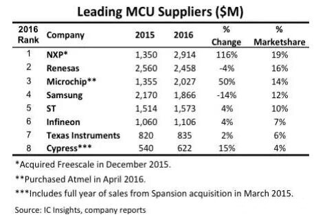 隨著物聯(lián)網(wǎng)領(lǐng)域應(yīng)用對MCU需求的進一步增長。為了搶占市場份額,供應(yīng)商們進行了多次的并購,并最終改變了MCU的供應(yīng)商排名。根據(jù)IC Insights的統(tǒng)計,全球最大的MCU供應(yīng)商由收購了Freescale的NXP擔當,而Microchip、Cypress也通過收購,提高營收,擴大了在MCU市場的份額。但因為在2016年,MCU的增長并沒有那么明顯,那就沒有更多的收購事件發(fā)生。