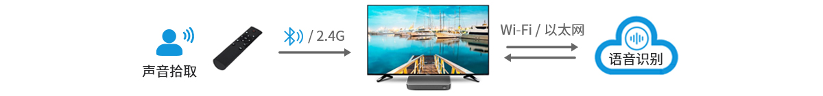 對(duì)于智能語(yǔ)音遙控器,用戶(hù)按下語(yǔ)音識(shí)別鍵后,遙控器告知電視啟動(dòng)語(yǔ)音識(shí)別功能,同時(shí)拾取用戶(hù)語(yǔ)音,將音頻數(shù)據(jù)發(fā)送至電視,電視根據(jù)云端識(shí)別結(jié)果執(zhí)行節(jié)目搜索或打開(kāi)相關(guān)應(yīng)用。
