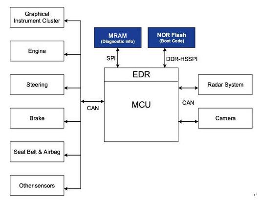 圖 1 為 ADAS 系統(tǒng)如何利用 MRAM 和 NOR 閃存的簡化框圖。外部 NOR 閃存通常用于存儲(chǔ)啟動(dòng)代碼。然而,ADAS 系統(tǒng)中的各種傳感器通過 CAN(控制器局域網(wǎng))接口定期向 MCU 發(fā)送數(shù)據(jù)。MCU 運(yùn)行自適應(yīng)算法,檢查是否可能碰撞或已經(jīng)發(fā)生碰撞。處理算法的運(yùn)行時(shí)間變量和傳感器的當(dāng)前狀態(tài)則存儲(chǔ)在 MCU 的存儲(chǔ)器中。