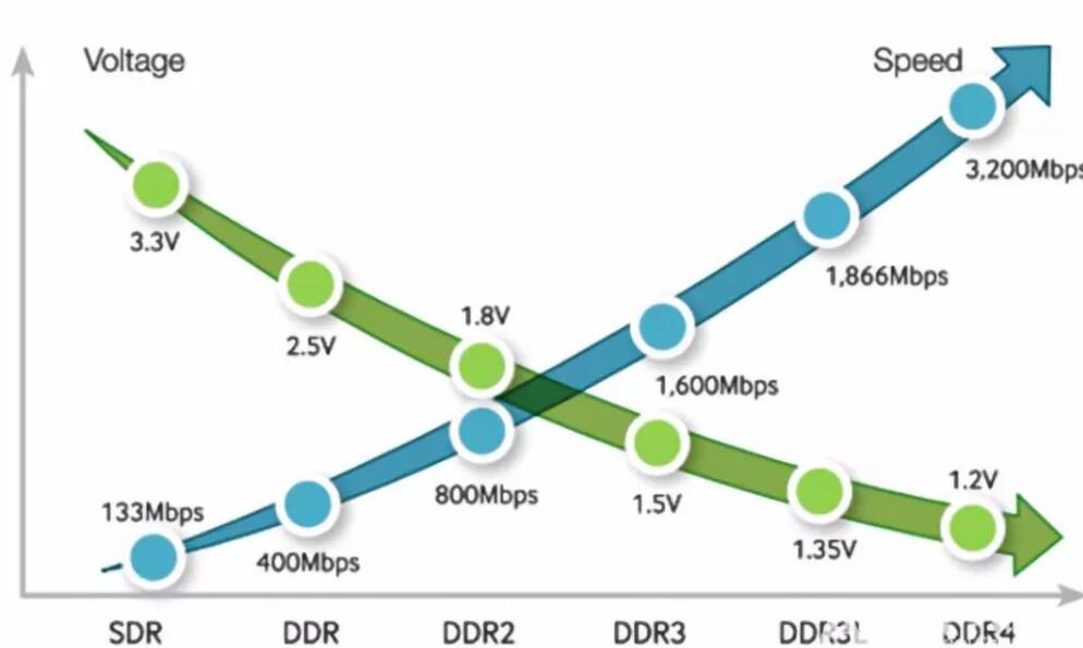 從DDR到DDR4,不同性能參數(shù)差異主要體現(xiàn)在2個地方:電源電壓、數(shù)據(jù)傳輸速率。電源電壓值越來越低,而數(shù)據(jù)傳輸速率卻是呈幾何倍數(shù)增長。