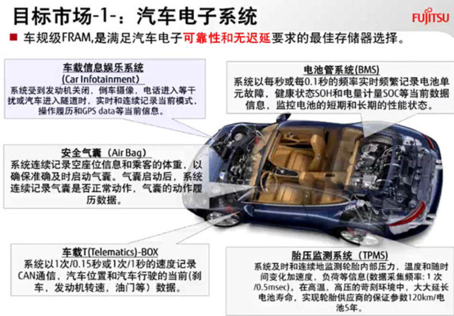 富士通FRAM早已能適用如汽車安全氣囊數(shù)據(jù)信息存儲(Airbag)、安全事故數(shù)據(jù)信息記錄軟件(EDR)、充電電池智能管理系統(tǒng)(BMS)、新能源汽車全車自動控制系統(tǒng)(VCU),新能源汽車CAN小盒子(CAN-BOX)、新能源汽車載終端設備(T-BOX)、胎壓監(jiān)測裝置(TPMS)、車輛駕駛輔助系統(tǒng)軟件(ADAS)及導航欄與信息內容車載多媒體(infotainment)等運用中的即時且不斷的數(shù)據(jù)信息存儲,所以能減少系統(tǒng)軟件復雜性并提升數(shù)據(jù)庫安全,。