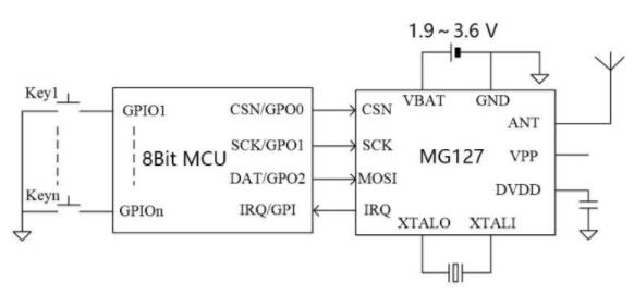 藍牙芯片MG127是具有低功耗、低成本的BLE 收發(fā)器,內(nèi)部集成了發(fā)射機、接收機、GFSK 調(diào)制解調(diào)器和BLE 基帶處理。電源電壓1.9~3.6,可以采用一個紐扣電池(3.0v)供電,具備3uA待機電流,20mA@0dBm持續(xù)發(fā)射,18mA持續(xù)接收等特點。MG127 采用DFN3x3 封裝,只需搭配低成本MCU 和少數(shù)外圍被動器件,即可實現(xiàn)BLE 遙控、藍牙電子秤等應用。