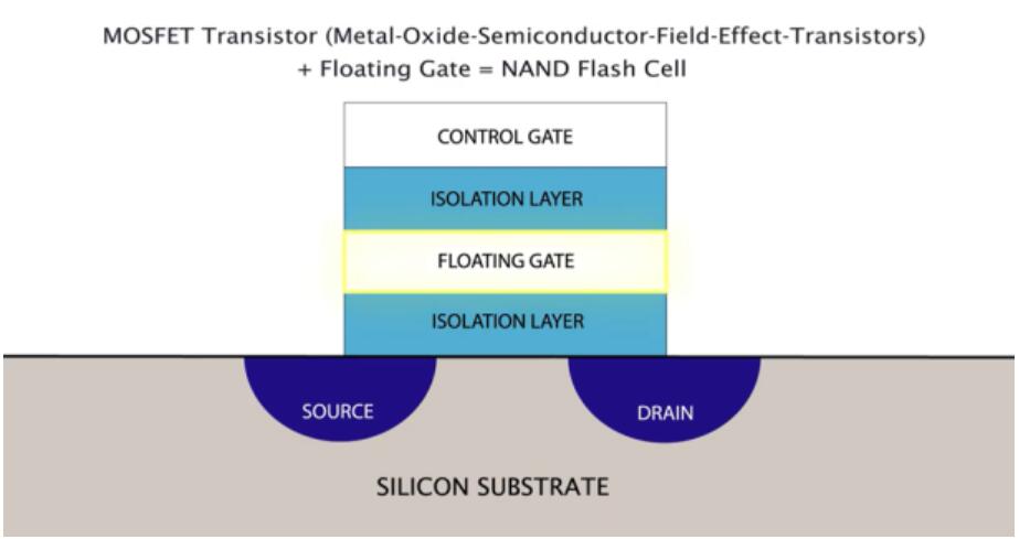 閃存單元由修改的場(chǎng)效應(yīng)晶體管(FET)組成,在控制柵極和通道之間的絕緣層中具有額外的“浮置”柵極。通過(guò)施加高壓將電荷注入到浮柵上(或從浮柵上去除)。這會(huì)改變打開(kāi)晶體管所需的柵極電壓,該電壓代表存儲(chǔ)在單元中的值。這些單元的陣列構(gòu)成一個(gè)塊,整個(gè)存儲(chǔ)器由多個(gè)塊組成。