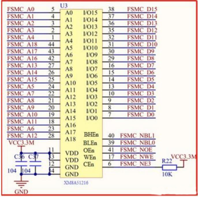 圖中A0~18為地址線,總共19根地址線(即2^19=512K,1K=1024);DQ0~15為數(shù)據(jù)線,總共16根數(shù)據(jù)線。CEn是芯片使能信號,低電平有效;OEn是輸出使能信號,低電平有效;WEn是寫使能信號,低電平有效;BLEn和BHEn分別是高字節(jié)控制和低字節(jié)控制信號;