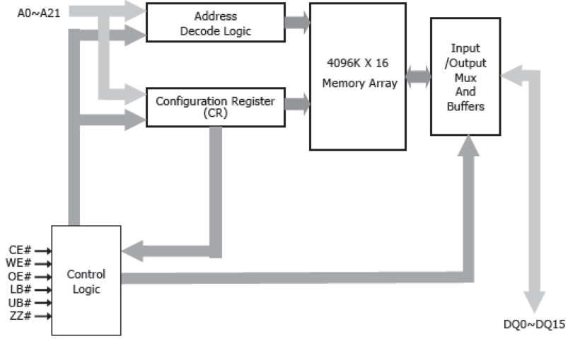 pSRAM,使用DRAM型存儲(chǔ)器單元,但該器件具有無(wú)刷新操作和極端低功耗技術(shù)。接口與低功耗異步類型SRAM兼容。該設(shè)備組織為4,194,304字x16位。