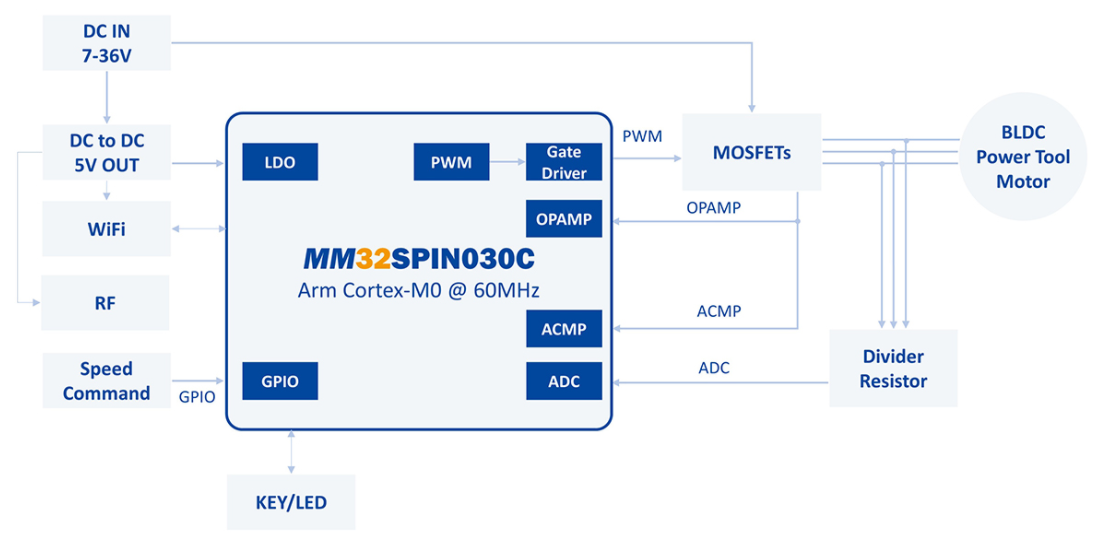 MM32SPIN030C這款MCU最大的亮點就是在其內(nèi)部集成了36V的3P-+3N預(yù)驅(qū),5V LDO高集成的電控SoC,可以直接驅(qū)動外部的6個P+NLMOS管,得益于內(nèi)部集成預(yù)驅(qū)的設(shè)計。