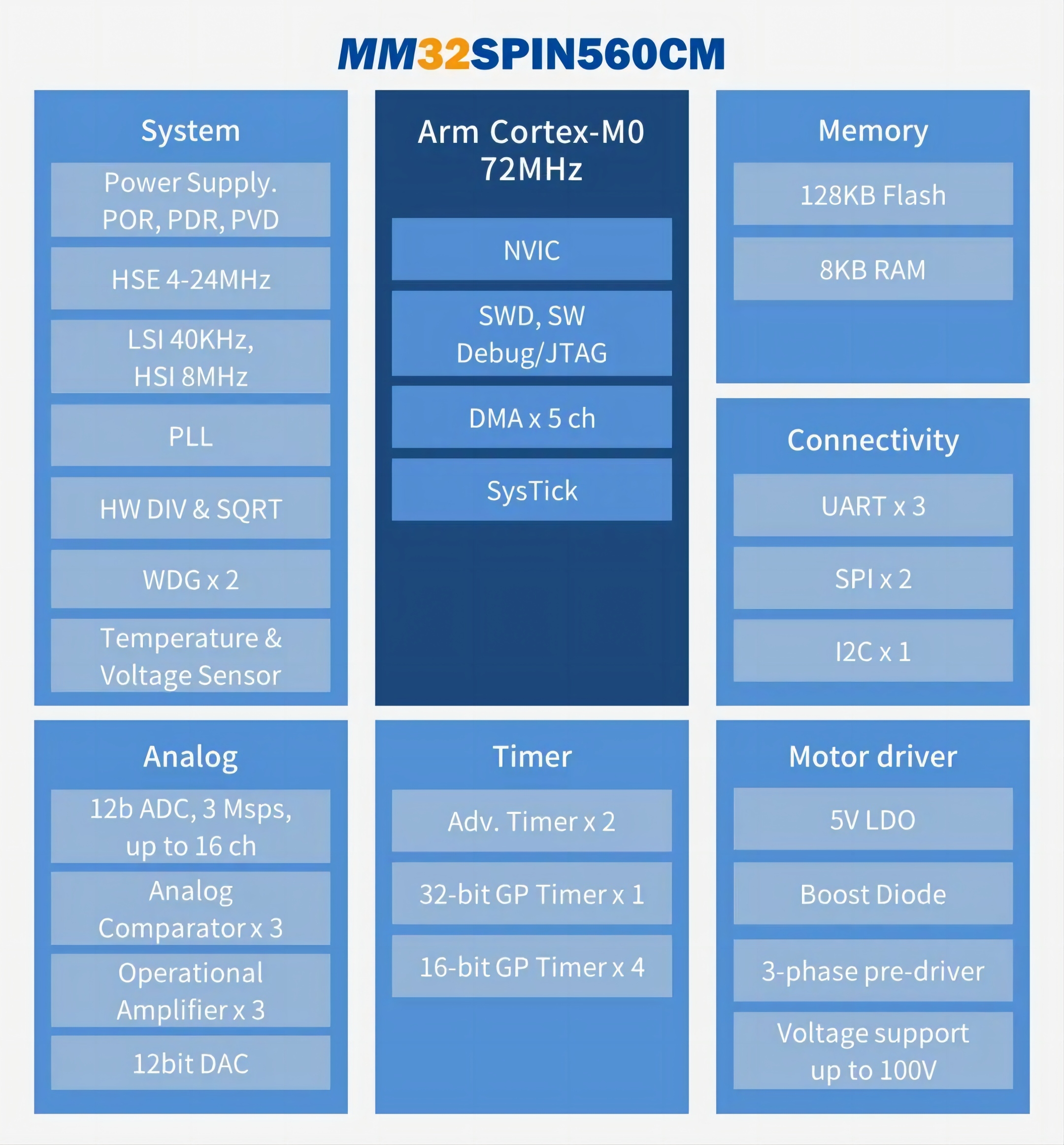 MM32SPIN560CM集成100V耐壓6N預驅,通過AEC-Q100認證,使用高性能的Arm®Cortex-M0為內(nèi)核的32位微控制器,最高工作頻率可達72MHz。