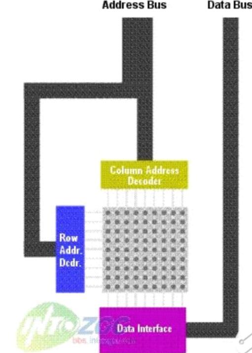 如果RAM對于CPU來說僅僅是一條“線”的話,還不能體現(xiàn)實際的運行情況。因為如果實際情況真的是如此的話,在實際制造芯片的時候,會有很多實際的困難,特別是在需要設(shè)計大容量的RAM的時候。所以一種更好的能夠降低成本的方法是讓存儲信息的“空格”排列為很多行--每個“空格”對應(yīng)一個bit存儲的位置。如果要存儲1024bits(2^10)數(shù)據(jù),那么你只要使用32x32(2^5*2^5=2^10)的矩陣就能夠達到這個目的了。很明顯一個32x32的矩陣比一個1024bit的行設(shè)備更緊湊,實現(xiàn)起來也更加容易。請看圖2.