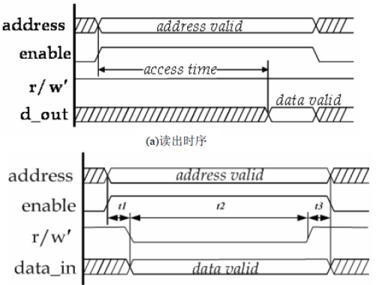 SRAM存儲(chǔ)器的讀寫時(shí)序。在讀出操作中,訪問時(shí)間(access time)就是指從地址有效算起,到有效數(shù)據(jù)輸出的時(shí)間;圖1.4 (b)中t1 是從地址和使能信號(hào)穩(wěn)定到寫信號(hào)有效所需的最小時(shí)間,t2 是寫信號(hào)無效之前必須保持的最小時(shí)間,t3是寫信號(hào)無效之后地址信號(hào)仍需保持的最小時(shí)間。t1、t2、t3 相加就是一個(gè)寫周期時(shí)間。