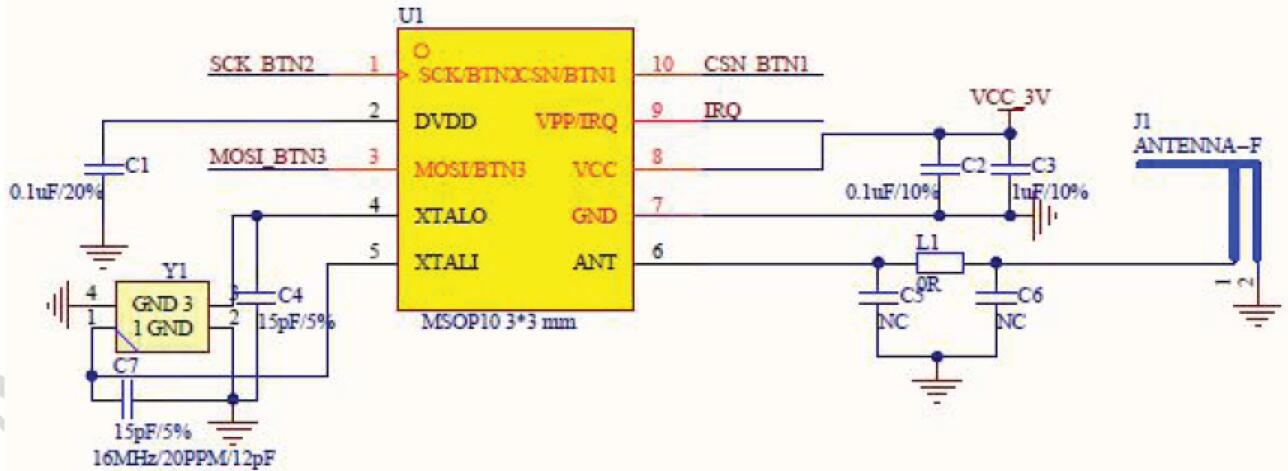 電源加兩個(gè)電容,如果用LDO 供電,分別取值1uF 和0.1uF 用以濾波;如果用紐扣電池供電,電容分別取值10uF和10uF 用以穩(wěn)壓。