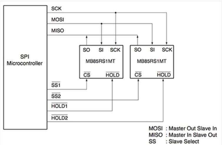 圖1:設(shè)備,如富士通MB85RS1MT允許使用熟悉的主/從配置為SPI-配備的MCU - 或使用使用設(shè)備的SI和SO端口,用于非基于SPI的設(shè)計,簡單的總線連接解決方案。 (富士通半導(dǎo)體提供)