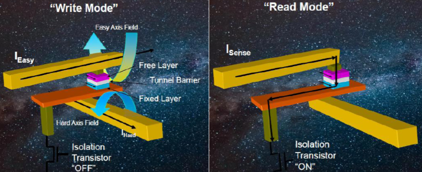 MRAM或磁性隨機(jī)存取存儲(chǔ)器使用具有鐵磁性材料的磁性“狀態(tài)”的1晶體管–1磁性隧道結(jié)(1T-1MTJ)體系結(jié)構(gòu)作為數(shù)據(jù)存儲(chǔ)元素。由于MRAM使用磁性狀態(tài)進(jìn)行存儲(chǔ)(而不是隨時(shí)間推移而“泄漏”的電荷),因此MRAM提供了相當(dāng)長的數(shù)據(jù)保留時(shí)間(+20年)和無限的耐用性。切換磁極化(寫入周期)是在電磁隧道結(jié)(MTJ)上方和下方的導(dǎo)線中產(chǎn)生脈沖電流的結(jié)果(見圖1)。電流脈沖產(chǎn)生的相關(guān)H場改變了鐵磁材料自由層的極化,這種磁開關(guān)不需要原子或電子的位移,這意味著沒有與MRAM相關(guān)的磨損機(jī)制。自由層相對于固定層的磁矩改變了MTJ的阻抗(見圖2)。阻抗的這種變化表示數(shù)據(jù)的狀態(tài)(“1”或“0”)。通過測量MTJ的阻抗來實(shí)現(xiàn)傳感(讀取周期)(圖3)。MRAM器件中的讀取周期是非破壞性的,并且相對較快(35ns)。讀取操作是通過在MTJ兩端施加非常低的電壓來完成的,從而在部件壽命內(nèi)支持無限的操作。