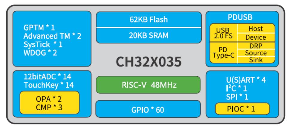 CH32X035系列是基于青稞V4C內(nèi)核設計的工業(yè)級微控制器。內(nèi)置USB和PD PHY,支持USB Host主機和USBDevice設備功能、PDUSB及Type-C快充功能,內(nèi)置可編程協(xié)議I/O控制器,提供OPA運放、CMP電壓比較器、USART串口、/2C、SPI、定時器、12位ADC、Touchkey等豐富外設資源。