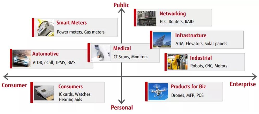 經過市場的長期廣泛驗證以及技術的不斷突破,富士通FRAM產品已成功應用于智能卡及IC卡等卡片領域、電力儀表及產業(yè)設備等工業(yè)領域,醫(yī)療設備及醫(yī)療RFID標簽等醫(yī)療領域、胎壓監(jiān)測及新能源汽車電池管理系統等汽車領域等等,涉及的應用超過200種,幾乎覆蓋所有主要領域!