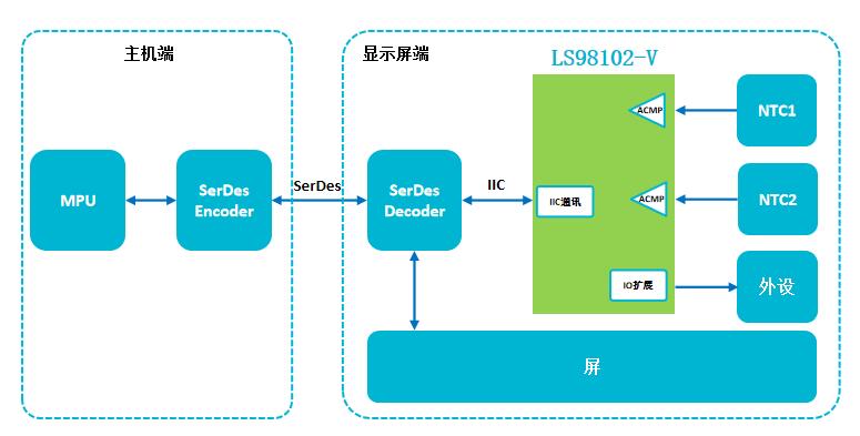 現(xiàn)場可重構(gòu)IC LS98102/-V采用QFN14封裝(車規(guī)級),供電范圍2.3V~5.5V,靜態(tài)電流100nA,12個可任意配置GPIO。該器件具有監(jiān)控2路NTC的溫度,溫度異常時發(fā)出中斷給SerDes端,主機控制發(fā)出關(guān)屏等指令信息擴展GPIO口,用于控制顯示屏端其他外設(shè)。